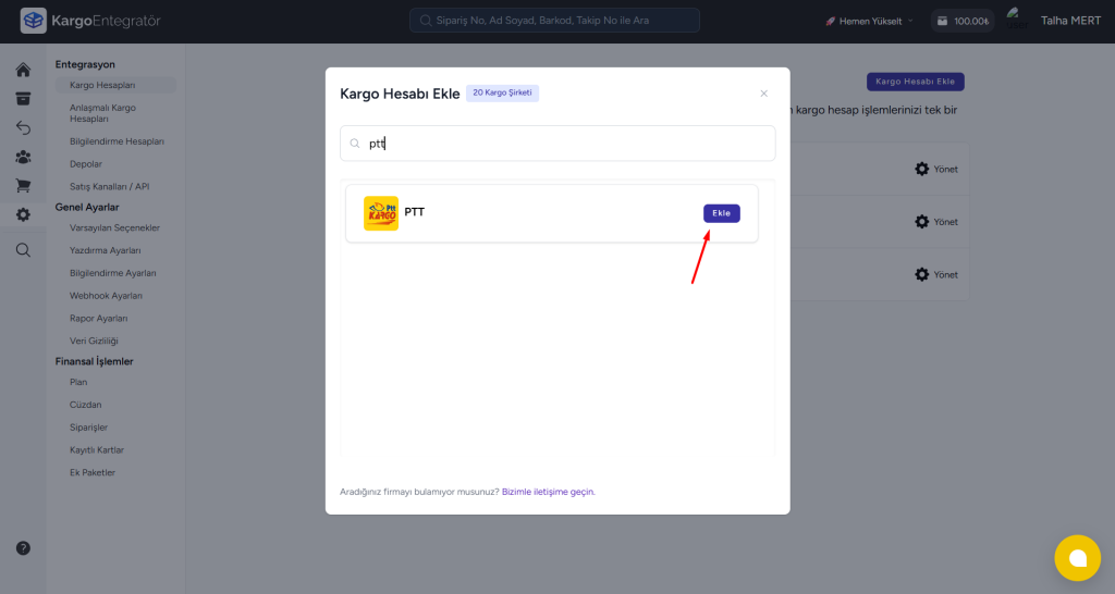 3-) Açılan sayfada “PTT Kargo” ekle ikonuna tıklıyoruz.