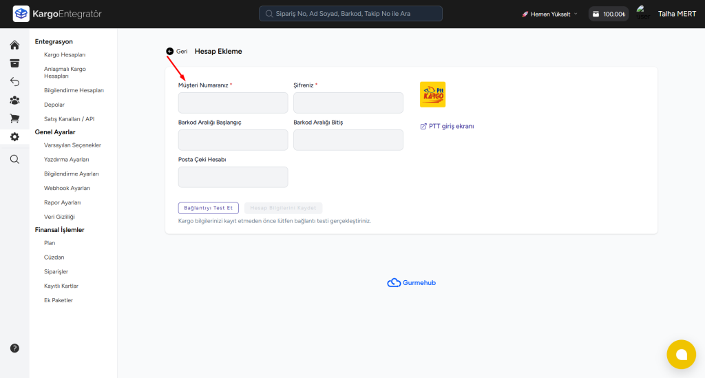 4-) PTT Kargo paneline giriş için kullandığınız bilgileri ilgili alanlara giriniz. Barkod aralığı ve Posta çeki hesabınız bulunmuyorsa bu alanları boş bırakabilirsiniz.