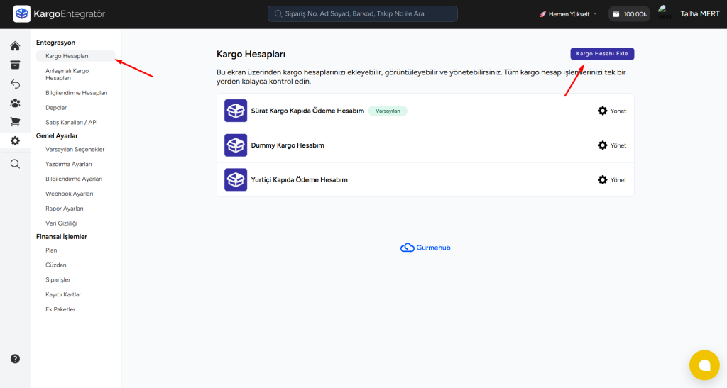 2-) Gerekli bilgileri edindiğinizde Kargo Entegratör panelinize girip sol tarafta bulunan “Ayarlara” tıklayıp, “Kargo Hesapları” alanına sonrasında “Entegrasyon Ekle” butonuna tıklıyoruz.