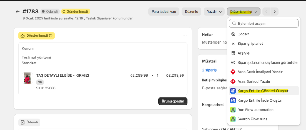 Diğer İşlemler menüsünden Kargo Entegratör ile Gönderi Oluştur seçeneğini tıklayın.