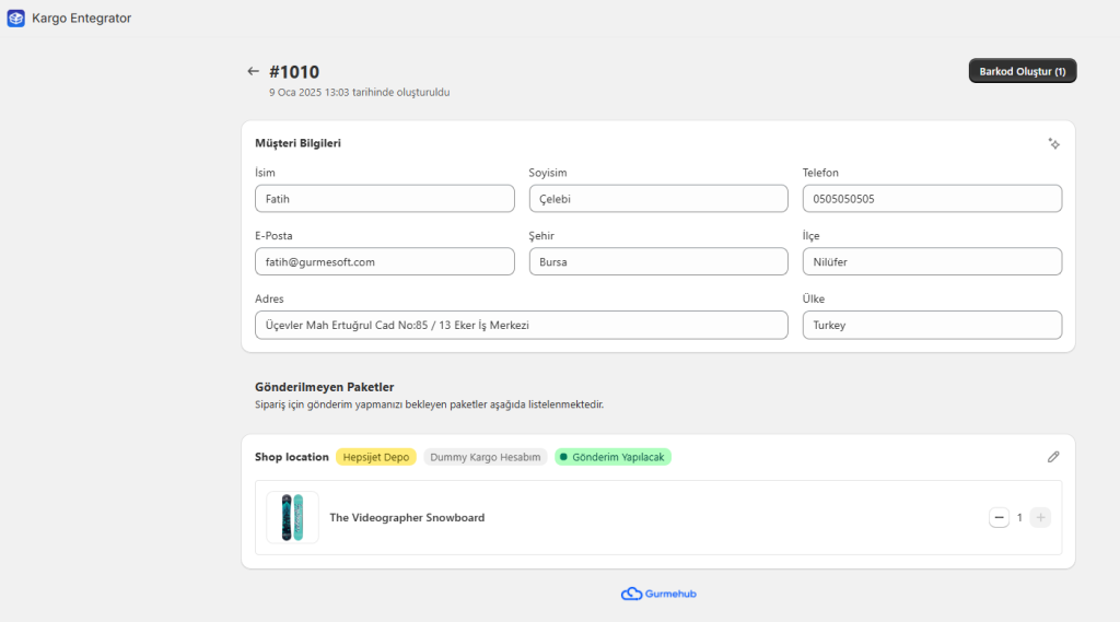 ⚠️ Dikkat: Gönderi oluşturma işleminin başarılı olması için ilgili siparişin durumunun "Gönderilmedi" olarak işaretlenmiş olması gerekmektedir.
