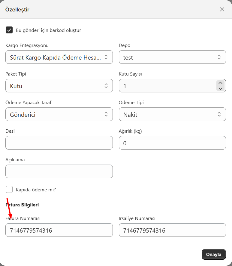 Kargo Entegratör üzerinden barkod oluşturma sırasında ‘724***** talep nolu (JOB_ID) 737**** fatura nolu (INVOICE_KEY) gönderi sistemde mevcuttur’ hatası alınabilmektedir. Bu hata, fatura numarasını düzenleyerek çözülebilmektedir. Aşağıdaki adımları izleyerek sorunu giderebilirsiniz: