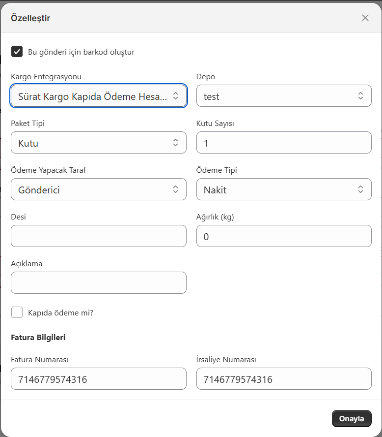 Kargo barkodu ve gönderi işlemlerinin sorunsuz çalıştığını doğrulayın.