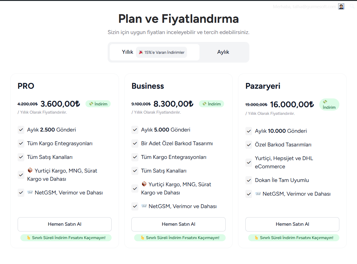Uygun Planı Seçme: İhtiyacınıza göre PRO, Business veya Pazaryeri paketlerinden birini seçebilirsiniz.