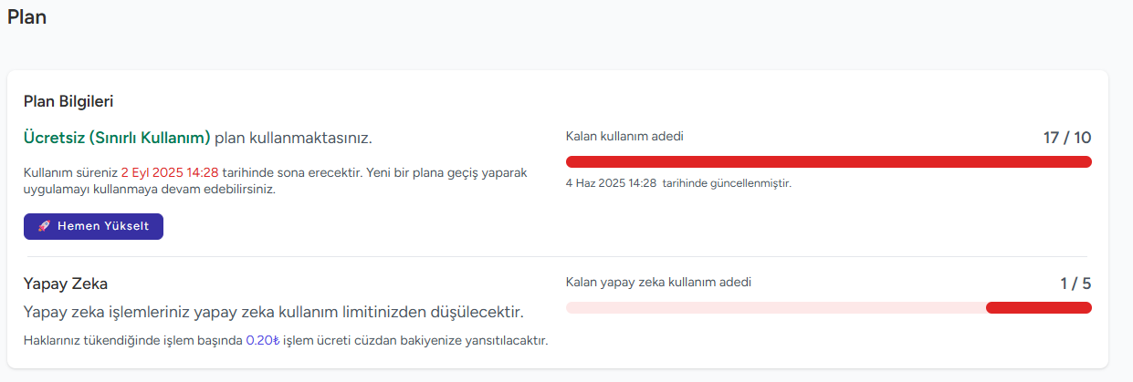 Ek Limitler: Ücretsiz haklarınız tükendiğinde, sistem kullanım başına (örneğin yapay zeka işlemleri için işlem başına 0.20 TL) cüzdan bakiyenizden ücretlendirme yaparak hizmet vermeye devam eder.